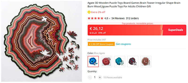 Для любителей пазлов, готовых к новым вызовам: очень сложные (на мой взгляд) деревянные пазлы. Размер 27.2x27.9 см, 164 элемента, несколько вариантов расцветок.