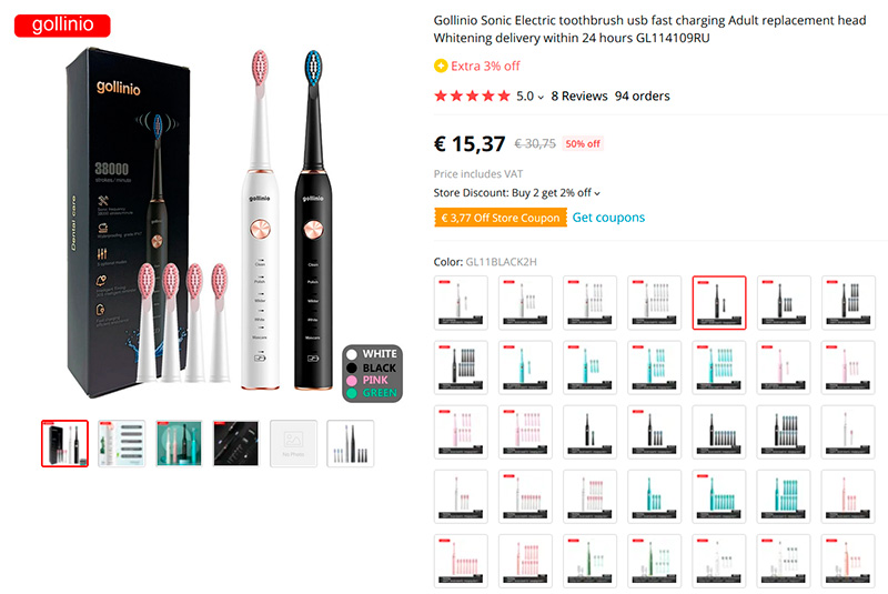 Дешевая электрическая зубная щетка Gollinio Sonic Electric различных цветов с дополнительными насадками - очень много разных комплектаций. Пять режимов очистки.