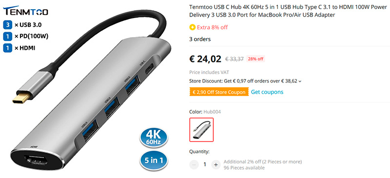 Ну а если нужно побольше портов и чтобы с HDMI, а не с Display Port - вот тоже хороший вариант: три порта USB 3.0, Type-C PD (до 120 ватт), HDMI 4K 60 Hz.