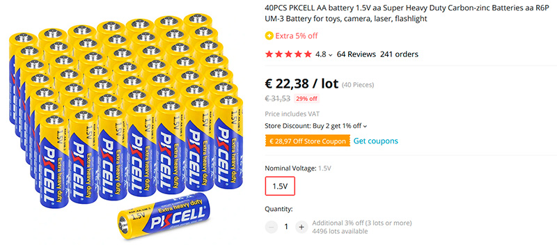 Покупаю я обычно батарейки Pkcell (их фирменный магазин на Aliexpress) - они себя хорошо зарекомендовали. И покупаю я батарейки двух типов: совсем дешевые цинк-углеродные (солевые) - для всяких пультов, часов и так далее, и более дорогие алкалиновые (щелочные) для устройств, которые имеют большее энергопотребление, но они и в два раза дороже