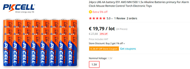 24 шт AA PKCell за 19.79 евро стоят в 3.3 раза дороже алкалиновых Pairdeer, которые продаются в Леруа (упаковка 10 шт АА стоит 208 руб). Тесты можно посмотреть на battest.ru.