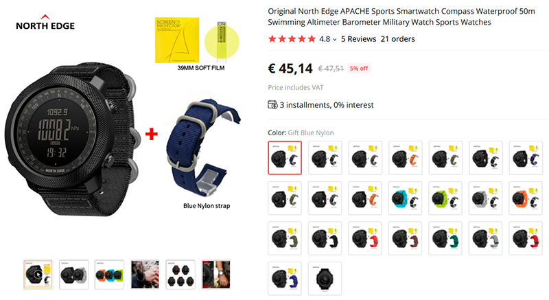 Мужские тактические часы North Edge APACHE. Водонепроницаемый корпус из нержавеющей стали, экран защищён прочным минеральным стеклом, устойчивым к появлению царапин, есть подсветка. Часы считают шаги, отображают прогноз погоды, показывают мировое время. Также в них есть компас, высотомер, барометр, будильник и секундомер. Батарейка идёт в наборе (по отзывам, ее хватает примерно на 9 месяцев). Есть комплектации с дополнительными цветными ремешками.