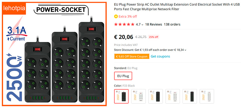 Удобные удлинители, рассчитанные на мощность до 2500 ватт: на 6, 8 и 10 розеток плюс 4 порта USB-A мощностью 15,5 ватт каждый и 2 порта Type-C мощностью 17 ватт. Длина кабеля - 2 метра. Удлинители черного и белого цветов.