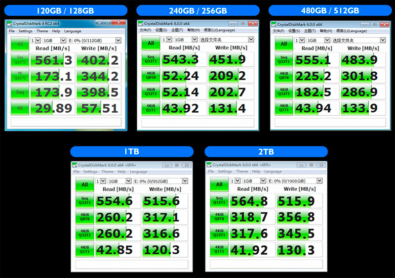Вот тесты скоростей дисков KingDian разных емкостей, которые дает производитель.