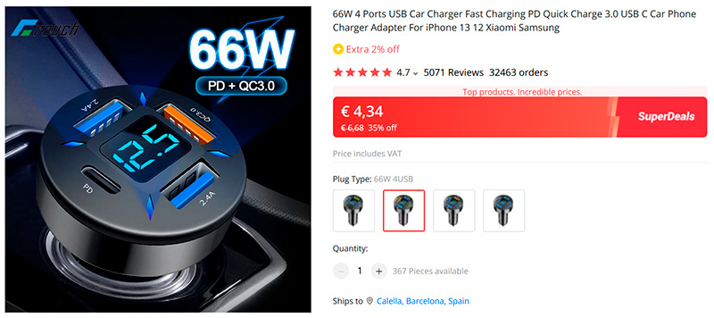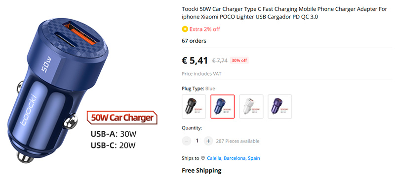 Зарядка смартфонов/планшетов от автомобильного прикуривателя давно стала быстрой. Вот современный вариант - адаптер Toocki на два порта (USB-A и USB-C) общей мощностью аж 50 ватт. Четыре варианта цветов. В отзывах пишут, что заявленную мощность адаптер выдает.