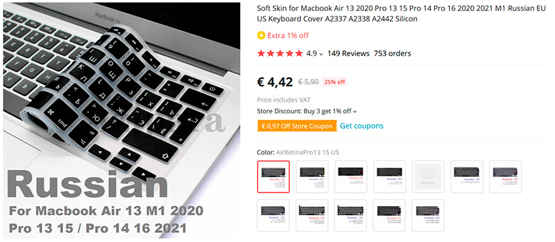 Для счастливых владельцев различных макбуков - устройство "2 в 1": силиконовая накладка на клавиатуру с русскими буквами, которая одновременно защищает макбук от мусора, а главное - защищает от, не дай бог, пролитой жидкости.
