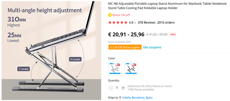 Искал жене удобную подставку для ноутбука, чтобы ноутбук был на уровне глаз (так меньше плечи устают при работе). Выбрал вот эту из алюминия - MC N8 Adjustable Portable Laptop Stand: доставили, проверено в действии - оказалось то, что нужно. Она еще и компактная складная. Пожалуй, и себе такую закажу: я для ноутбука все равно в поездки беру эргономичную клавиатуру и мышь, а при этом тоже нужно, чтобы ноутбук был на возвышении.