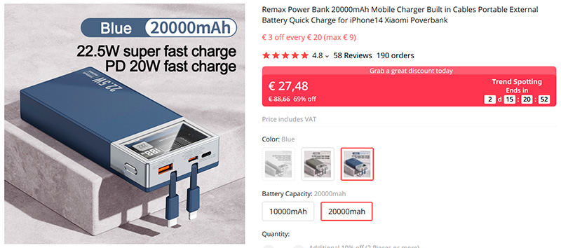 Внешний аккумулятор Remax на 10000 и 20000 мАч. Два встроенных кабеля Type-C и Lightning, мощность зарядки 22,5 ватта, два входных порта, три выходных, дисплей с процентом заряда аккумулятора.