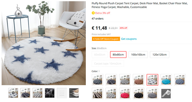 Недорогие пушистые круглые коврики разнообразных расцветок и трех вариантов размеров. Есть купоны на скидку. Там же можно заказать двухсторонний скотч для закрепления ковра на месте, чтобы его не сдвигали всякие пушистые домашние животные, а то знаем мы их?