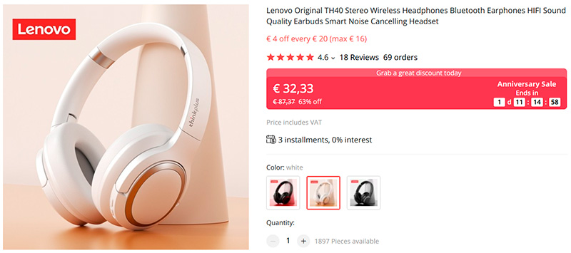 Недорогие беспроводные полноформатные наушники Lenovo TH40 с активным шумоподавлением. Драйверы 40 мм, Bluetooth 5.0, кодеки SBC/AAC, импеданс 32 Ом, три варианта цветов: два черных с красными и серебристыми вставками, один белый с серебристыми вставками.
