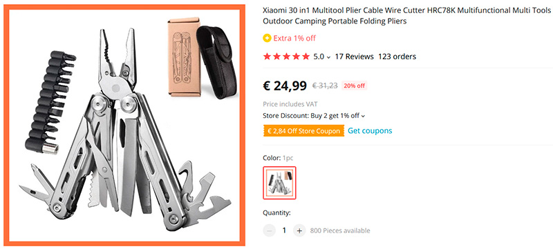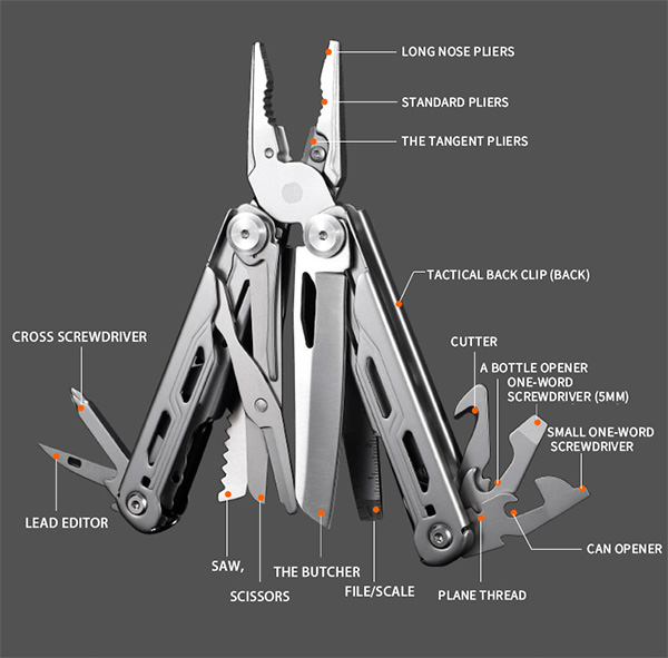 Мультитул "30 в 1". Плоскогубцы, бокорезы, нож, мини-пила, открывалка, ножницы, разные отвертки, пилка. Сталь 440A, в комплекте также идет набор бит и чехол.