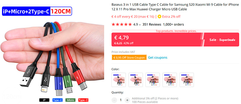 Всегда нужный и полезный универсальный кабель для зарядки "3 в 1": microUSB, Type-C, Lightning. Длина 30 и 120 см. Есть варианты с двойным кабелем каждого типа (то есть "4 в 1"): microUSB, Type-C и Lightning. Я именно этот вариант использую: тут кабели разных цветов, очень легко отличать. У меня есть такие же одноцветные - они значительно менее удобные.