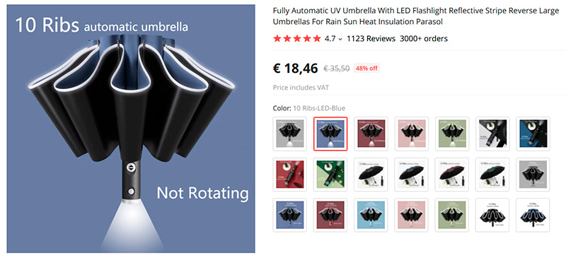 Продвинутый автоматический реверсивный (вода при складывании остается внутри) зонтик c поворачивающимся на небольшой угол фонариком в рукоятке. 10 усиленных упругих спиц из стекловолокна, защита от ветра, светоотражающие полоски безопасности. Различные цвета.