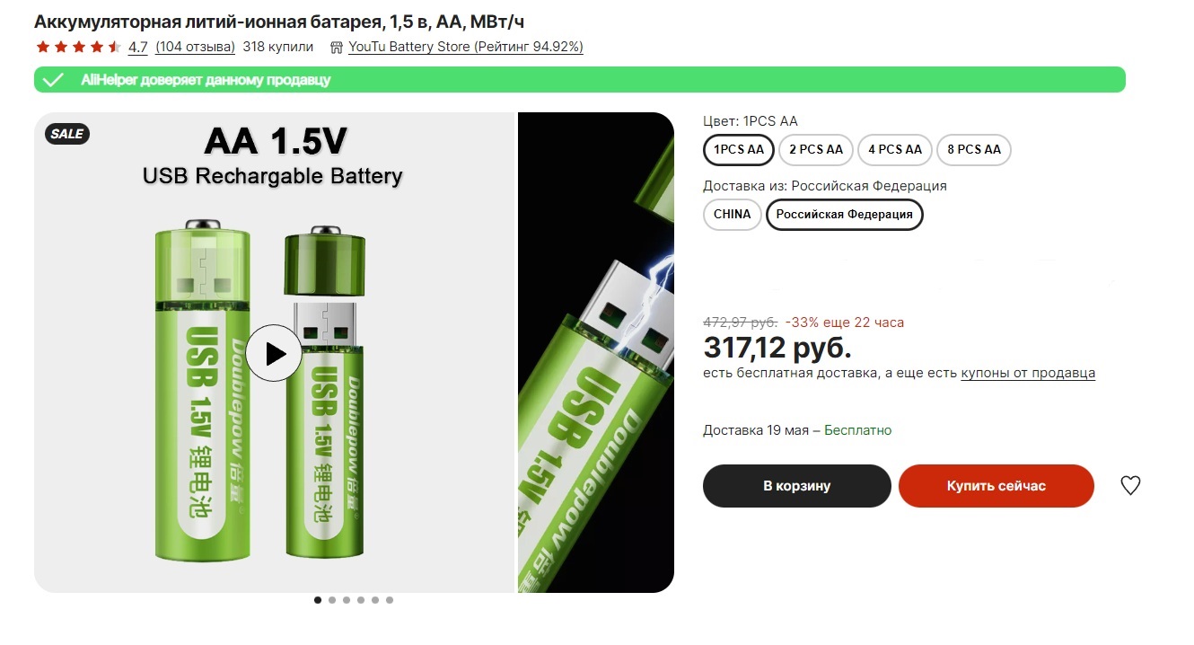 Аккумуляторная литий-ионная батарея, 1,5В, формат AA, 1800mW̲h̲.