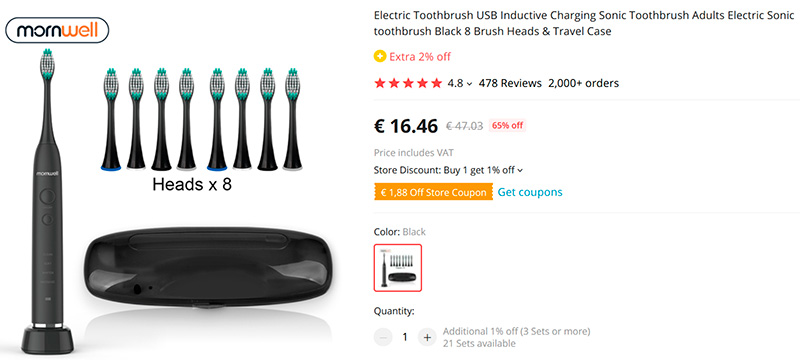 Недорогая электрическая зубная щетка в хорошем комплекте: чехол и 8 дополнительных насадок (их нужно менять каждые 3 месяца, так что хватит больше чем на 2 года). Четыре режима работы, индикатор заряда аккумулятора, зарядка через USB.