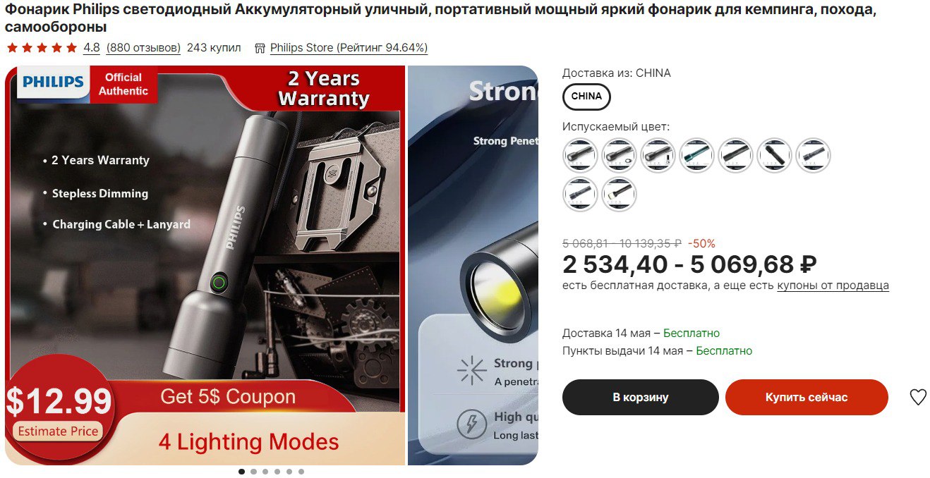 Светодиодные аккумуляторные фонарики Philips от 1241₽ с купоном и скидкой продавца на AliExpress. Компактные перезаряжаемые фонарики с прочным корпусом, имеют световой поток от 300 до 550 люмен в зависимости от выбранной модели, несколько режимов работы, много заказов и положительных отзывов.