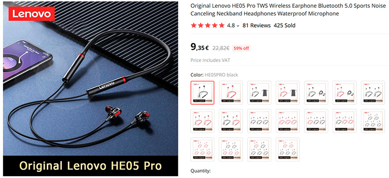 Очень дешевые спортивные влагозащищенные беспроводные наушники Lenovo HE05 Pro. Управление кнопочное, автономность - до 9 часов. Разные цвета.