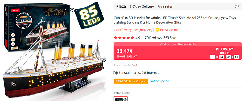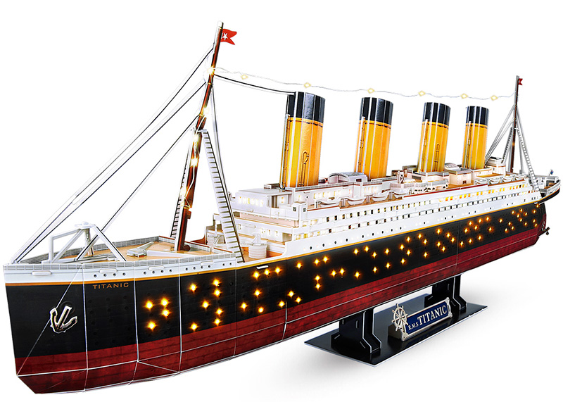Сборная модель "Титаника", состоящая из 266 элементов. Есть подсветка из 85 лампочек, так что после сборки модель может служить украшением интерьера. Длина модели - 88 сантиметров. Есть инструкция по сборке.