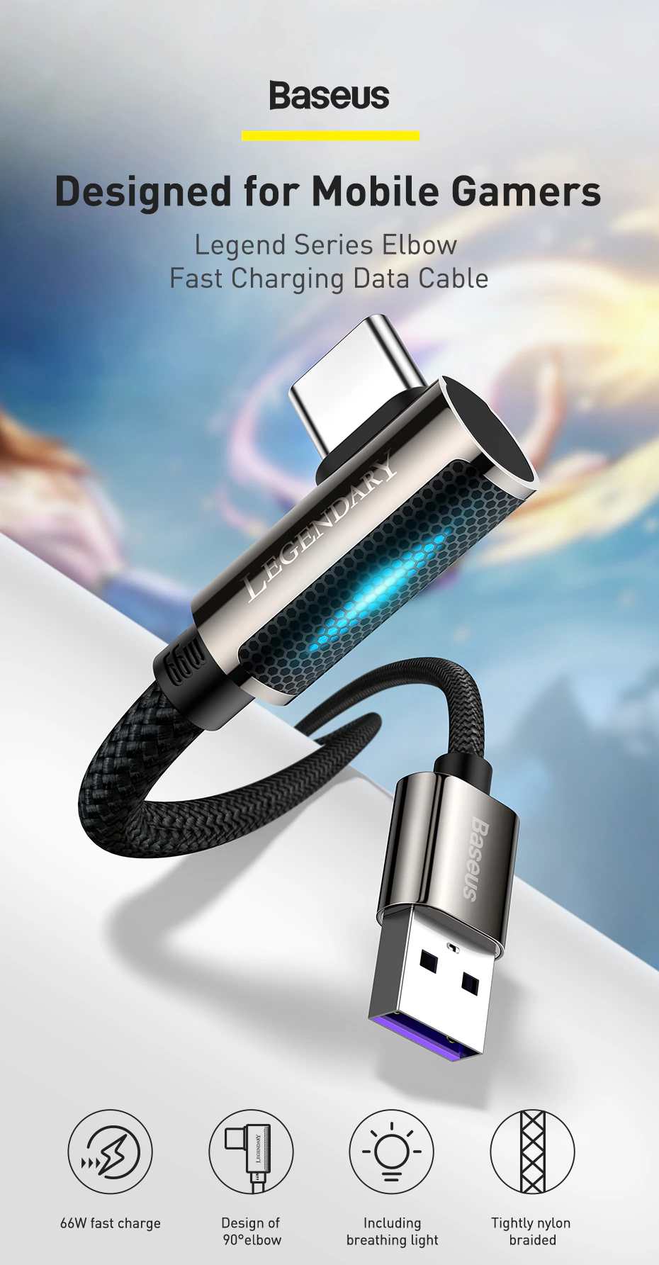 USB to Type-C. Поддерживает зарядку до 66W. Порт под углом 90°. Нейлоновая оплетка. Защита от перегрева. Подсветка порта. Скорость передачи данных 480Мб/с. Длина на выбор - 1 иди 2 метра. Официальный продавец Baseus на Али.