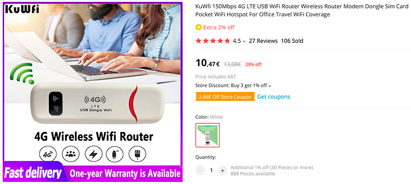Совсем дешевый и сверхкомпактный Wi-Fi-роутер KuWfi для мобильного Интернета. Вставляете в него симкарту, после чего получаете точку доступа Wi-Fi со скоростью до 150 Мбс, поддерживающую до 8 устройств. Для дома, для дачи, для сада-огорода, для рыбалки и охоты пуще неволи. Питается от USB-порта, а что у него нет своего аккумулятора - ну так подключаете его к любому внешнему аккумулятору, вот вам и автономная точка доступа!