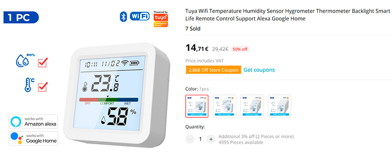 Датчик температуры и влажности Tuya с поддержкой Wifi и голосовых помощников Alexa и Google Home. Поддерживает соответствующие сценарии, при необходимости может давать сигнал на включение обогревателя или увлажнителя воздуха.