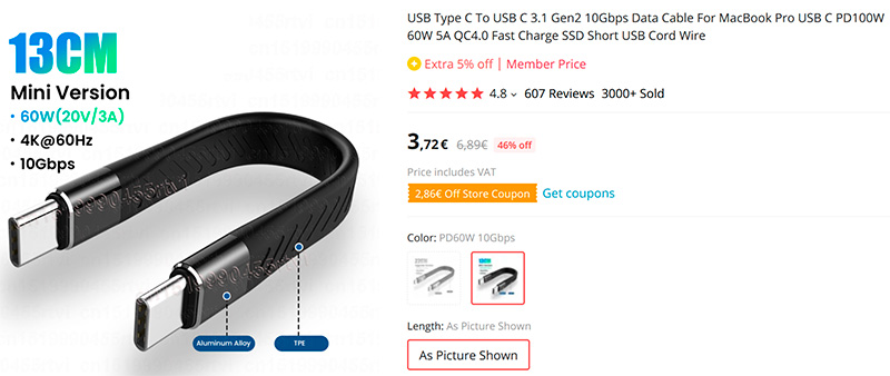 Для зарядки и для подключения к компьютеру нередко бывают нужны короткие кабели, особенно когда речь идет о подключении внешних аккумуляторов. Вот неплохой вариант - кабель 13 см для ПК, ноутбуков и макбуков с поддержкой мощности зарядки до 60 ватт.