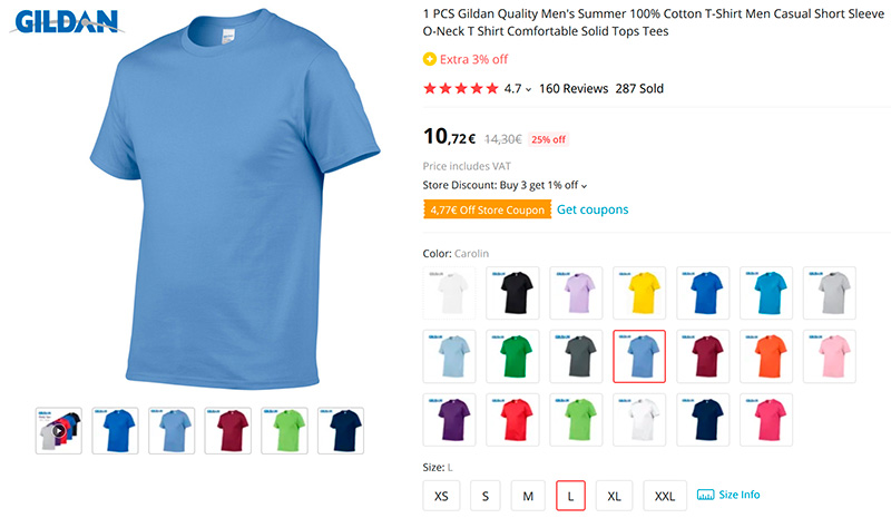 Мужские футболки из 100% хлопка самых разнообразных однотонных расцветок. Размеры вроде как соответствуют европейским, но на всякий случай сверьтесь с таблицей.