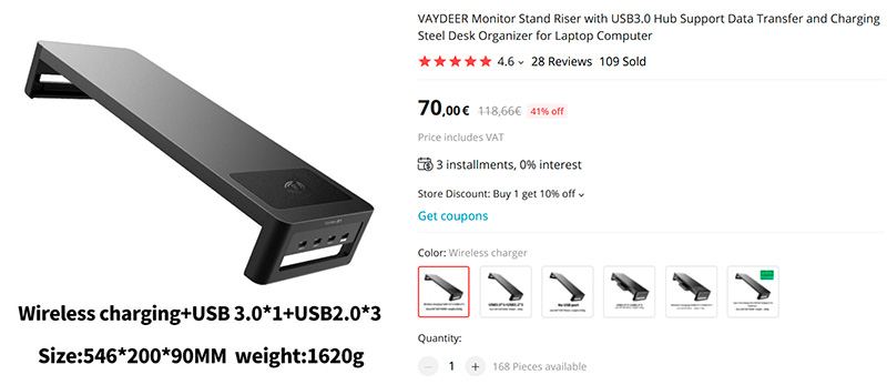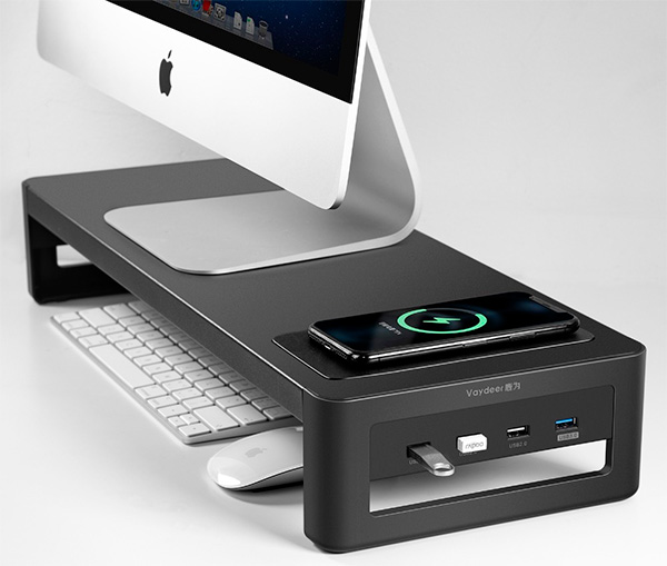 Удобная штука - подставка под монитор с четырьмя USB-портами и беспроводной зарядкой.  И там несколько вариантов: от совсем простого, без USB-хаба и зарядки, до самого продвинутого, где у подставки есть еще и ящички для мелочевки.