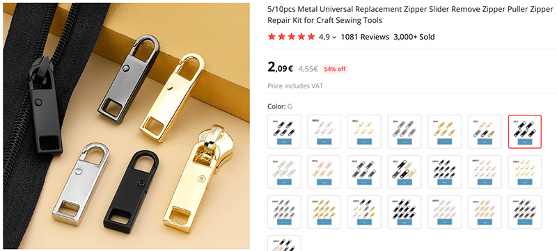 Случайно на это наткнулся и понял, что мне это нужно - металлические запасные язычки для молнии разных цветов. У меня на паре молний язычки сломались, теперь там вместо них - скрепки, что и не слишком удобно, и совершенно точно не слишком эстетично. Заказал: штука копеечная, а в хозяйстве совершенно точно нелишняя.
