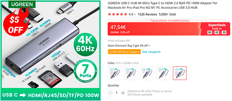 Самые продаваемые хабы для ноутбуков от Ugreen на Aliexpress. Хабы "5 в 1", "6 в 1", "7 в 1" и даже "9 в 1"! Все что душа пожелает: Power Delivery до 100 Вт, HDMI 4K60Hz, гигабитный Ethernet, microSD и SD, порты USB 3.0. При этом все очень компактное и качественное - Ugreeen все-таки!