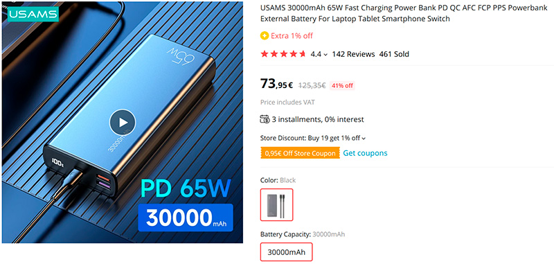 Ну а если вам нужен аккумулятор для ноутбука, то у того же производителя есть вот такой вариант на 30000 мАч мощностью 65 Вт с поддержкой PD и QC. У него также есть дисплей, демонстрирующий уровень заряда.