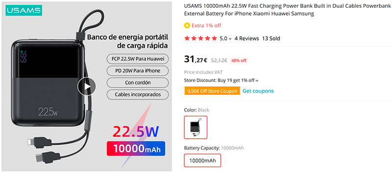 Компактный внешний аккумулятор Usams на 10000 мАч с поддержкой Power Delivery мощностью 20 Вт, с дисплеем, на котором отображается уровень заряда, и двумя встроенными кабелями Lightning и Type-C.
