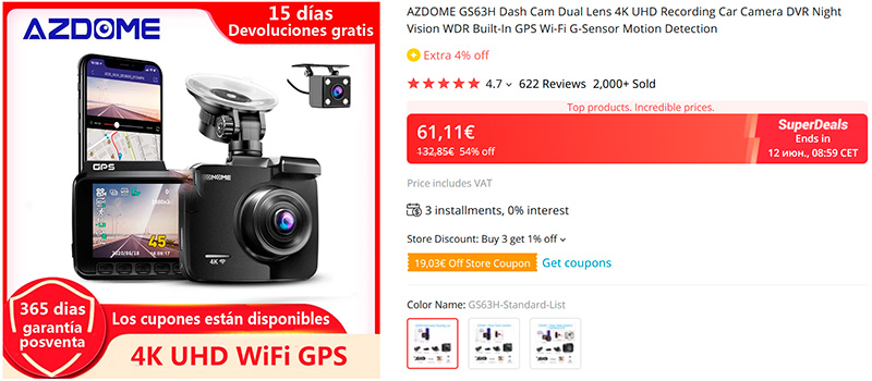 Очень пристойный компактный видеорегистратор Azdome GS63H сейчас можно купить дешевле €60. И за эти деньги вы получаете разрешение 2К, встроенный GPS, Wi-Fi, G-сенсор, ночной режим, режим WDR и прочие прелести. Модель неновая (вот мой обзор), но актуальности никак не потеряла.