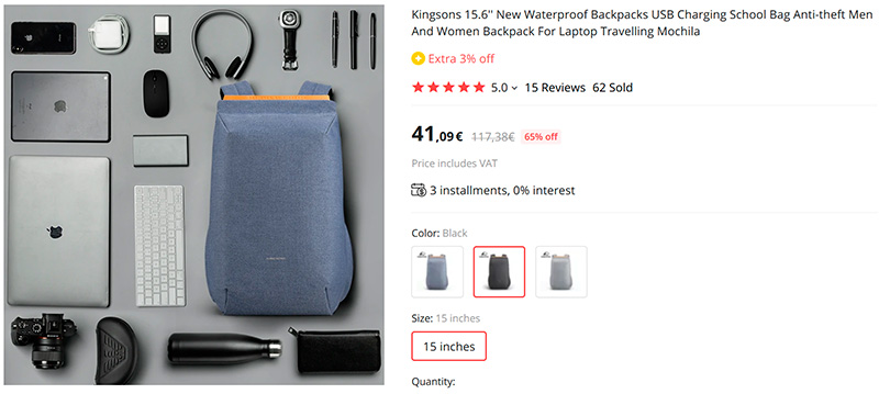 Защищенный от воров водонепроницаемый рюкзак из полиэстера. Внешнее отделение закрывается на скрытую молнию. Внутри много карманов и есть отделение для 15,6-дюймового ноутбука. Спинка рюкзака сделана из мягкого пружинящего слоя с "дышащим" покрытием. Лямки выдерживают нагрузку до 54 кг. Размер рюкзака - 45х29х15 см, вес - 660 граммов. Есть USB-порт для зарядки. Три варианта цветов. Судя по всему, аналог вот этого рюкзака, который стоит в три раза дороже.
