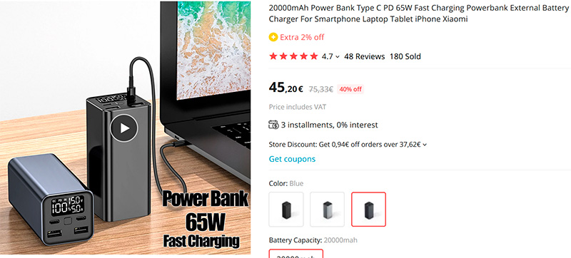 Интересный внешний аккумулятор на 20000 мАч мощностью 65 Вт с дисплеем. Поддерживает Power Delivery и QC, подходит для ноутбуков, может одновременно заряжать до четырех устройств: у него два порта Type-C до 65 Вт и два порта USB-A до 22,5 Вт. На дисплее отображается заряд аккумулятора, режим зарядки, а также вольты и амперы (мощность зарядки).