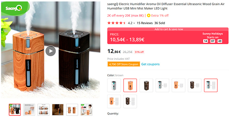 Увлажнитель-аромадиффузор SaenQ. Три варианта цветов, есть комплектация с дополнительными десятью хлопковых фильтров для ароматерапии. Емкость для воды 300 мл, два режима работы - на 5 или 10 часов работы. В корпусе есть окошко для отслеживания уровня жидкости. Питается через USB-порт.