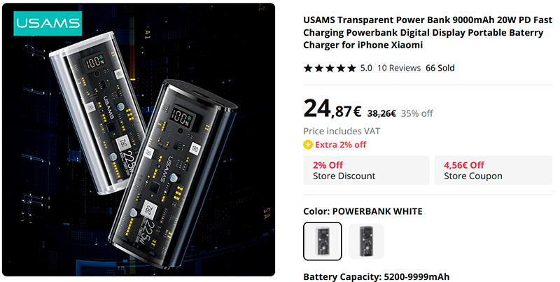 Любопытный прозрачный внешний аккумулятор Usams на 9000 мАч. Цифровой дисплей, поддержка Power Delivery на 20 Вт, мощность зарядки до 22,5 Вт. Выходы - USB-A и USB-C.