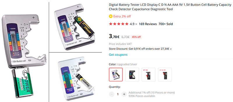Абсолютно необходимая в домашнем хозяйстве вещь - тестер для проверки уровня заряда практически всех типов батареек и аккумуляторов. Серебристый и черный. Там еще есть тестер другого типа, но он менее удобный.