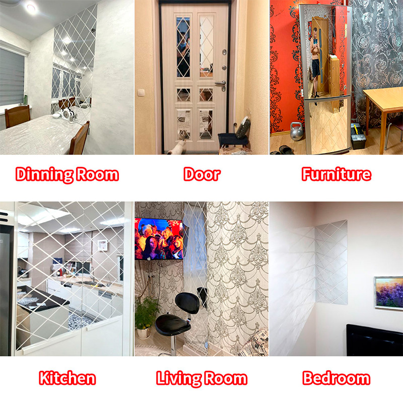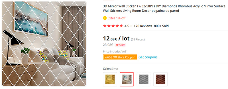 У друзей увидел. Они в гостиной над невысоким шкафчиком, на котором стоят всякие красивые штуки, выложили прямоугольник из таких зеркальных ромбов - и получилось очень эффектно. Спросил, что и откуда - ответили, что все с того же Aliexpress: наборы таких зеркальных ромбов, которые очень легко монтируются (приклеиваются) к разным поверхностям и, таким образом, весьма оживляют помещение. Там есть разные наборы разных цветов: 17, 32 и 58 элементов.