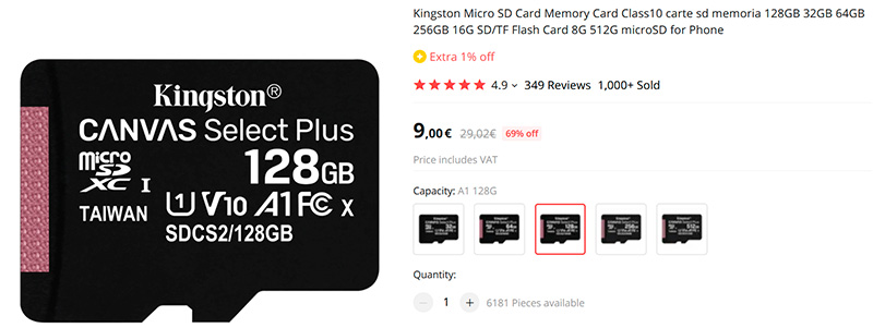 Скоростные карты microSD Kingston Canvas Select Plus на 32, 64, 128, 256 и 512 ГБ в официальном магазине Kingston на Aliexpress. Отзывов под 350, все отличные. 256 ГБ за €20 - хорошая цена, в Яндекс.Маркете они стоят в районе €30 (в рублях). Возьму для планшета - закинуть сериалов и кино для разъездов.