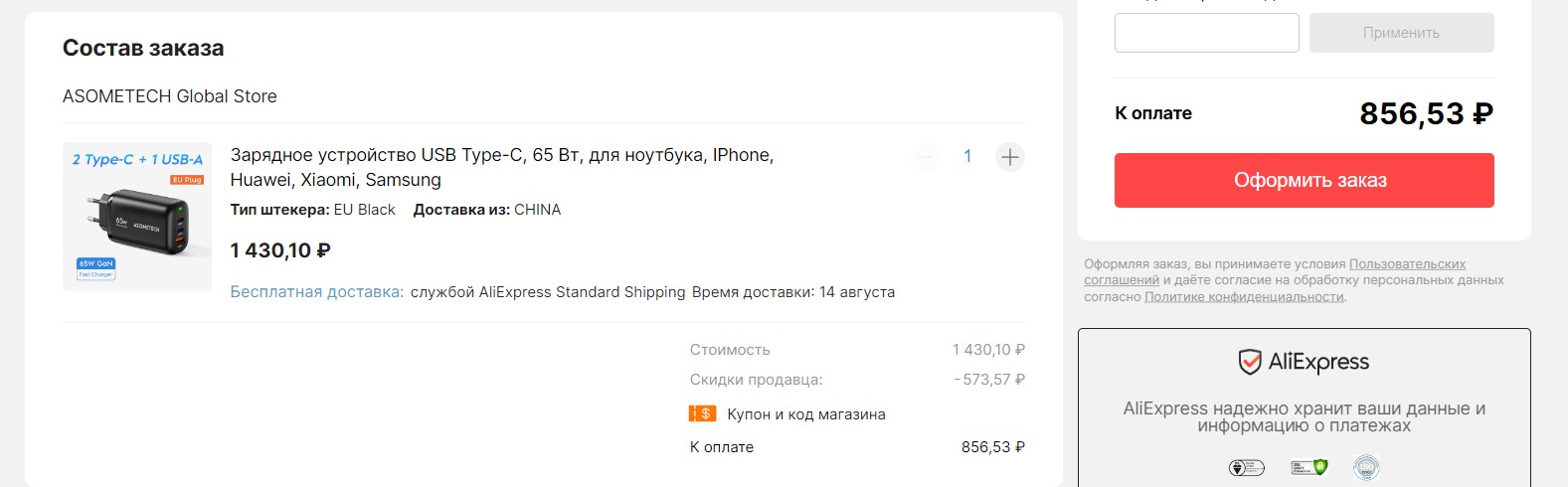 Теперь итоговая цена - 856,53 ₽