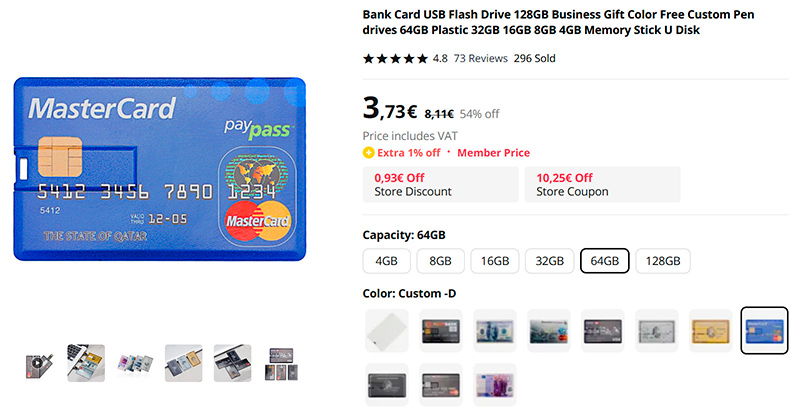 Удобные флешки в формате пластиковых карт - хранить в бумажнике. Дешевые, потому что медленные. Но как раз для того чтобы записать на них сканы всяких документов и всякую чувствительную информацию (архивированную и запароленную, от греха). Большой выбор разных видов.