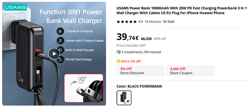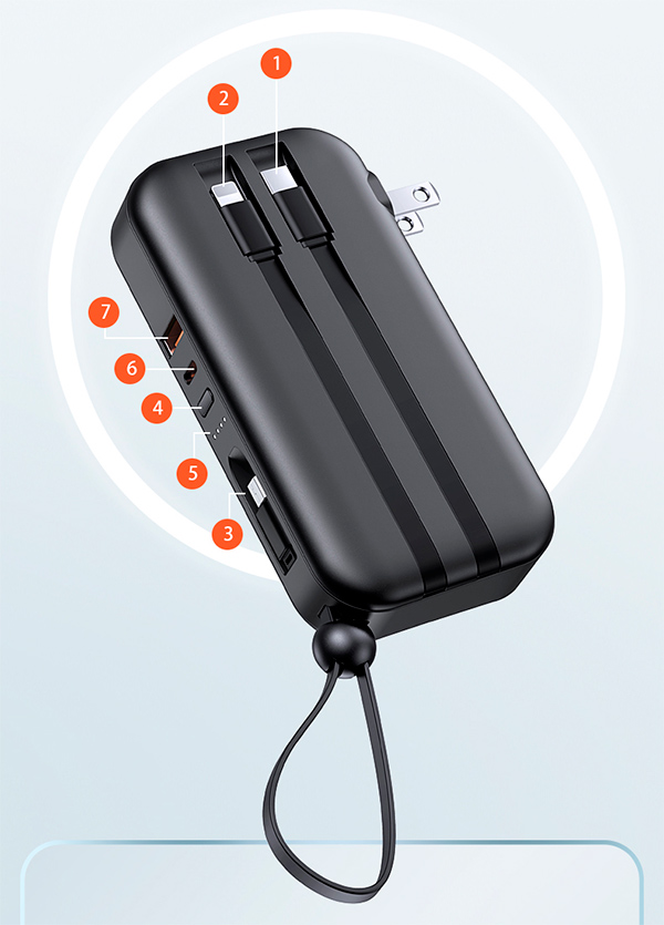 Интересный внешний аккумулятор USAMS "3 в 1". Это компактный внешний аккумулятор емкостью 10000 мАч, мощностью 20 Вт, с поддержкой стандартов быстрой зарядки QC, PD, SCP, AFC и FCP, а также тремя встроенными короткими кабелями с коннекторами microUSB, Type-C и Lightning.