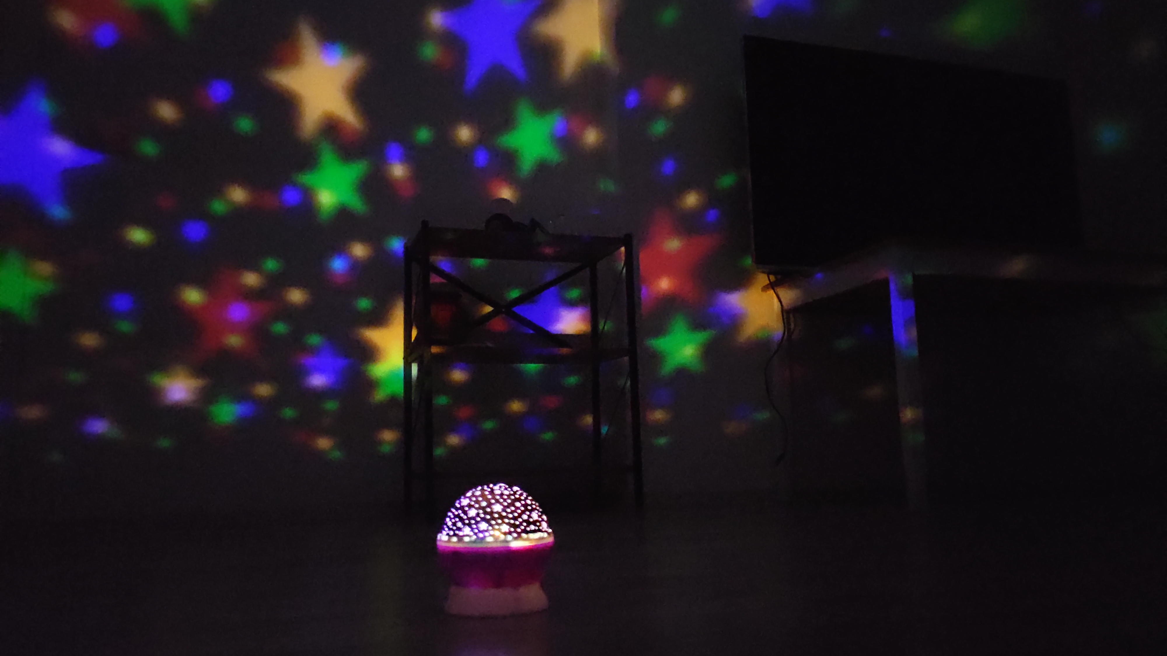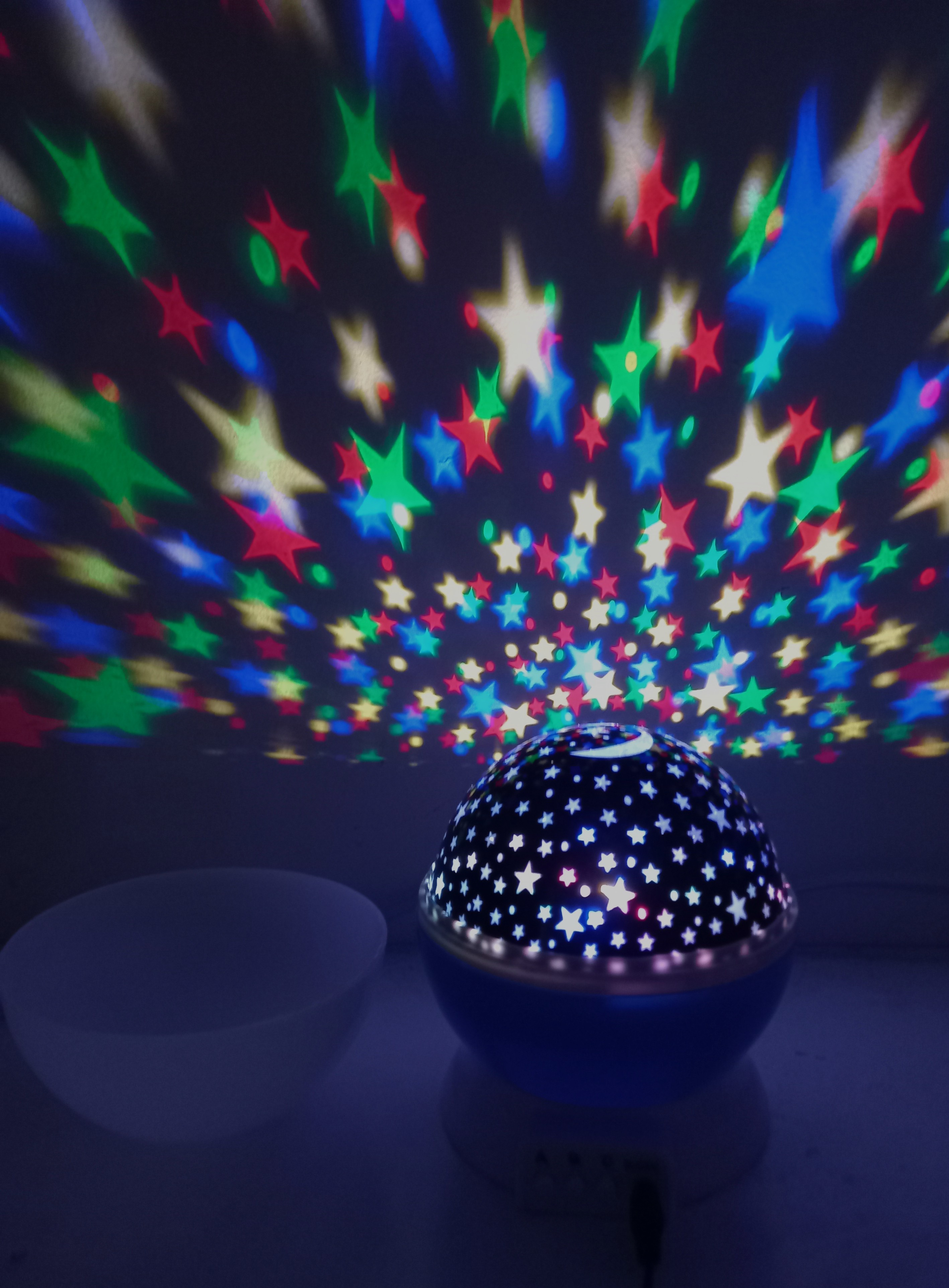 Может крутиться (двигатель бесшумный), может не крутиться. Звёзды разноцветные или одного цвета по выбору. Надоели звёзды - надеваем матовый колпак. Питание от USB или батареек. Красиво, ребёнок в восторге и хорошо засыпает.