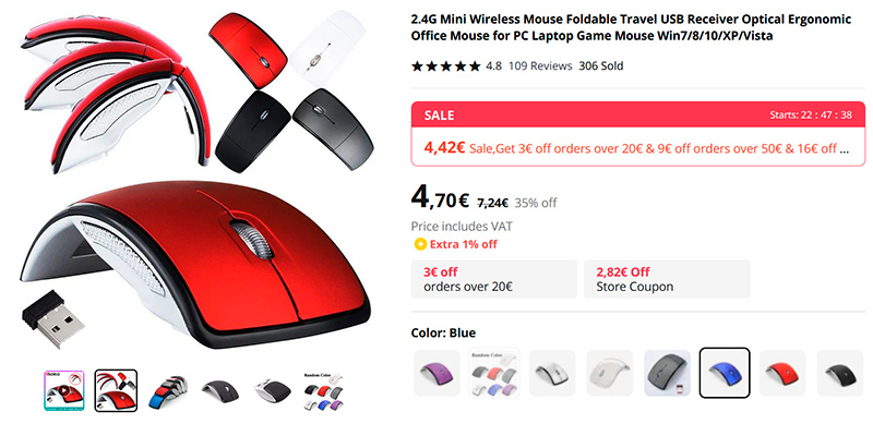 Дешевая складная беспроводная мышка для ноутбуков: в сложенном виде занимает совсем немного места, при этом достаточно удобная. Также есть на выбор разные цвета.