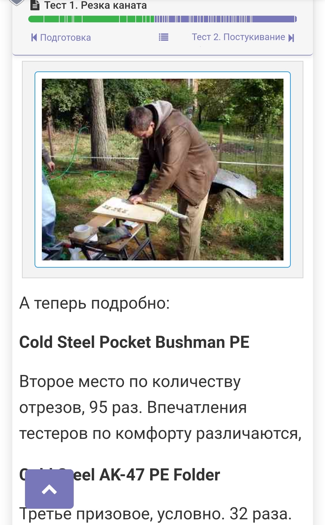 Как в американской передаче "Forged in fire" - так кузнецы куют и закаливают ножи, потом этим ножом строгают доску, рубят рога, протыкают канистры, разбивают горшки (тест на прочность) - потом тем, что осталось, разрезают ковры, ряды игральных карт, яблок, режут свиную тушу, рубят татами (тест на остроту). Если "ваш нож заметно пострадал в предыдущем тесте на рубку гвоздя", то в этом тесте "он что-то цепляет шелковую ткань своими щербинами, это минус".