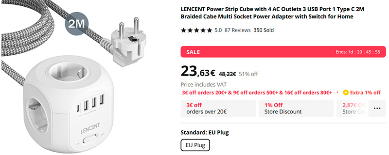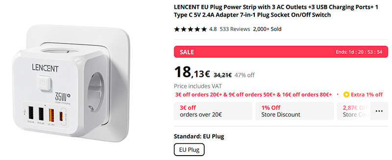 У тройников с USB-портами редко встречается быстрая зарядка. Но не у данного тройника от компании Lencent. Три европейские розетки, два порта USB-A с мощностью зарядки до 12 Вт, порт Type-C с мощностью 15 Вт. Также есть встроенный выключатель. По ссылке есть и другие варианты тройников этого производителя.