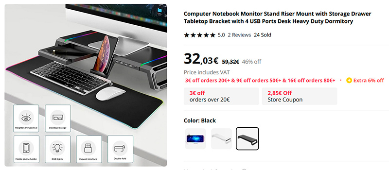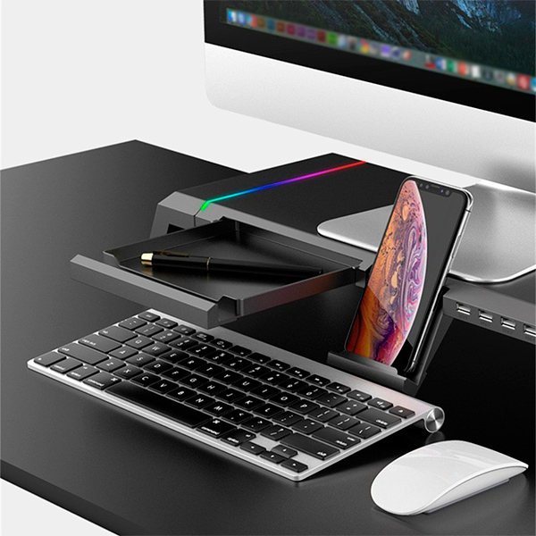 Многофункциональная, удобная и стильная подставка для монитора со встроенным USB-хабом, подставкой под смартфон и ящичком для мелочей. А еще у нее есть RGB-подсветка и два варианта цветового исполнения.