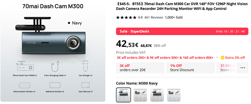 Компактный видеорегистратор 70mai Dash Cam M300 сейчас можно купить всего за €43. При этом у него разрешение 2304x1296 пикселей, WiFi, управление через приложение, ночной режим, режим наблюдения на парковке, угол обзора 140 градусов. Есть вариант комплектации для постоянного отслеживания на паркинге.