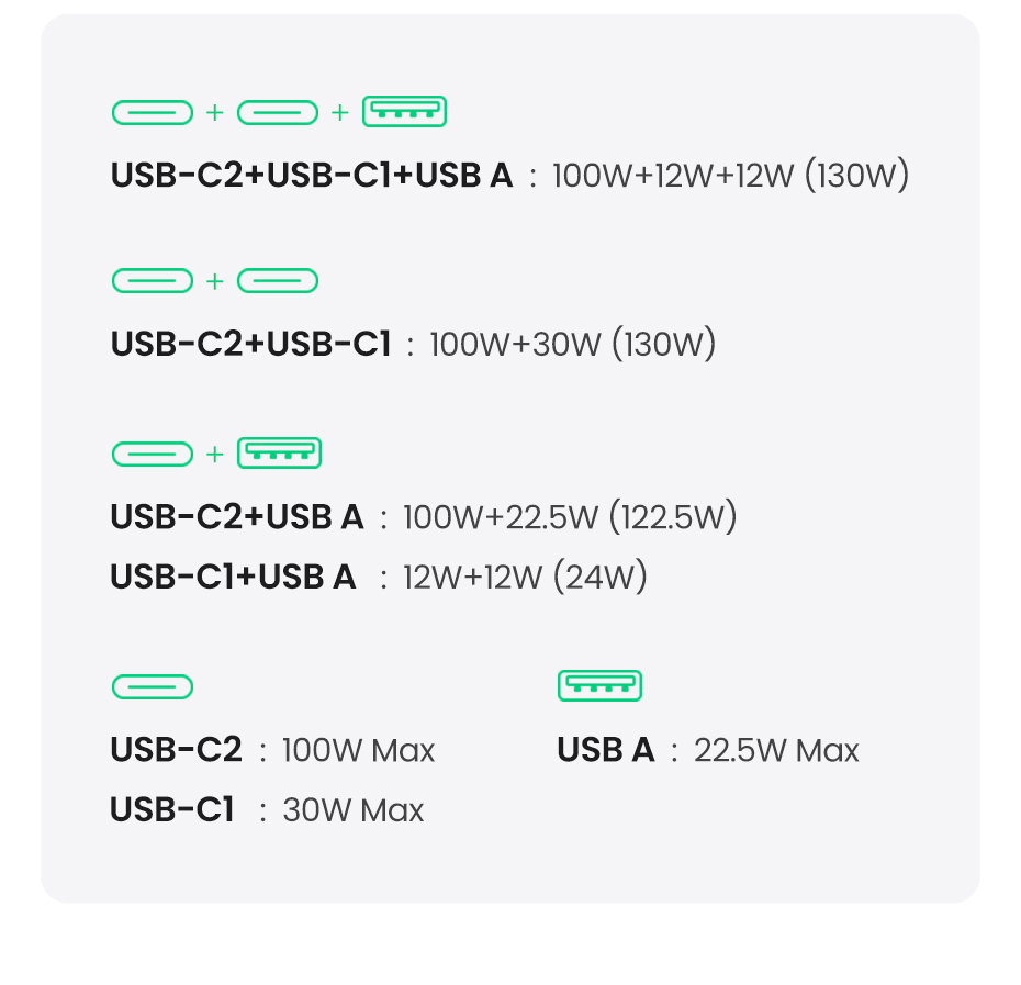 - USB-C2 : PD3.0, PPS, QC4 +(QC4.0/QC3.0), FCP, AFC, APPLE 5V 2.4A, BC1.2